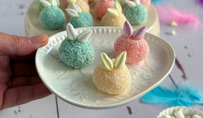 Brigadeiros de coco en versión mini pensados para Pascua: bolitas elaboradas con leche condensada, manteca y coco rallado, coloreadas y rebozadas en coco, decoradas con mitades de mini nubes como orejitas.