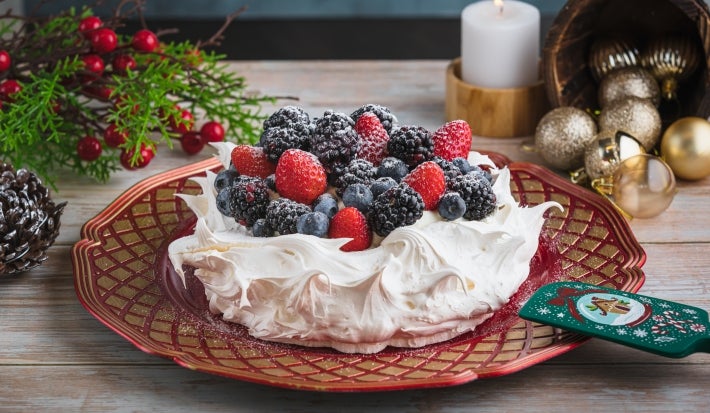 Receta de Pavlova navideña con yogur y frutos rojos, fácil y deliciosa.