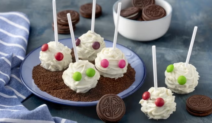 Receta de deliciosas Popcakes de Momias Negresco elaboradas con Galletas NEGRESCO, Leche condensada Moça, Topping de Chocolate Blanco y Cereal NESCAU